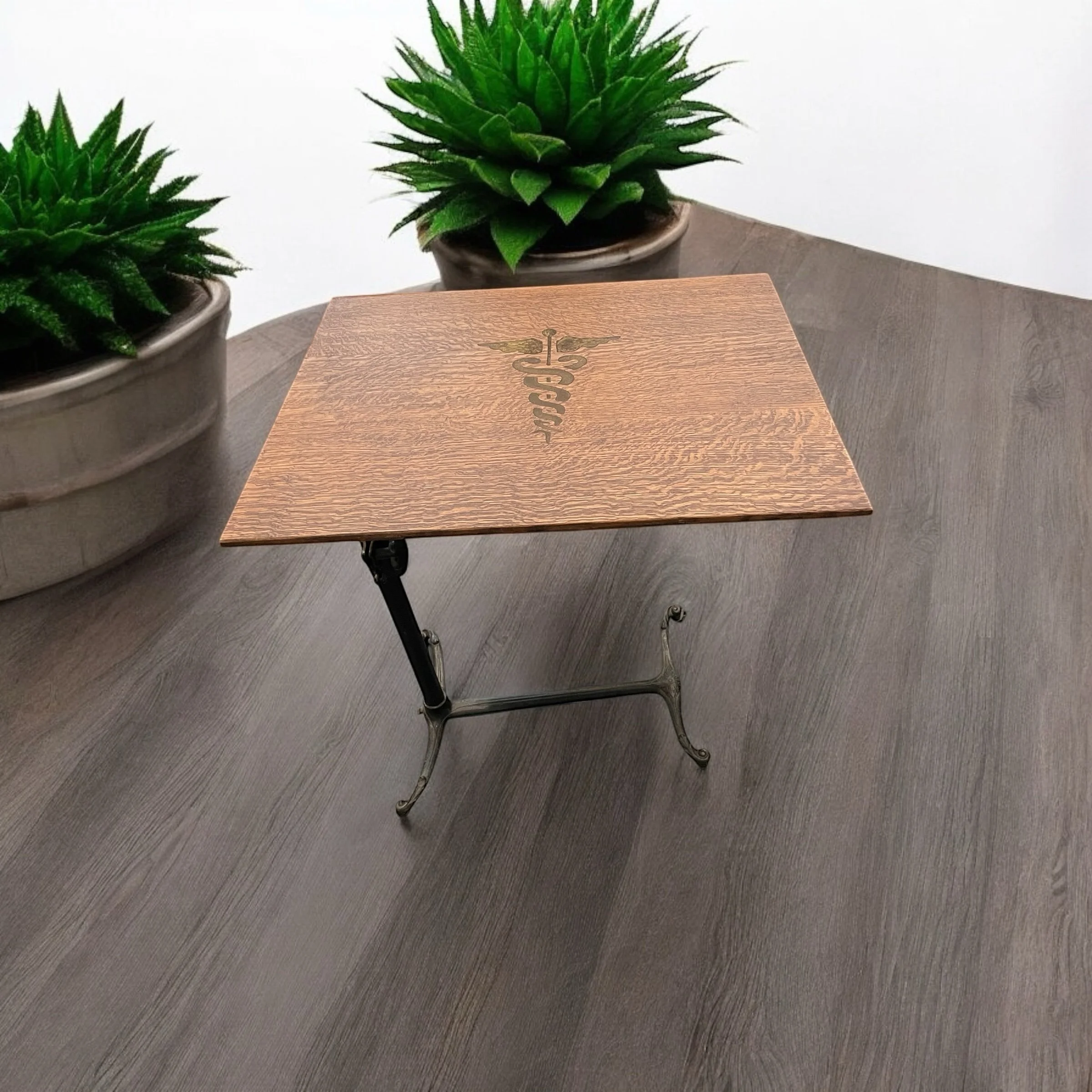This is a 1904 hospital bedside table with a cast iron base. The top was replaced with oak since the original top was not restorable. The same table top shape was perserved and a caduseus was added for a unique appearance.