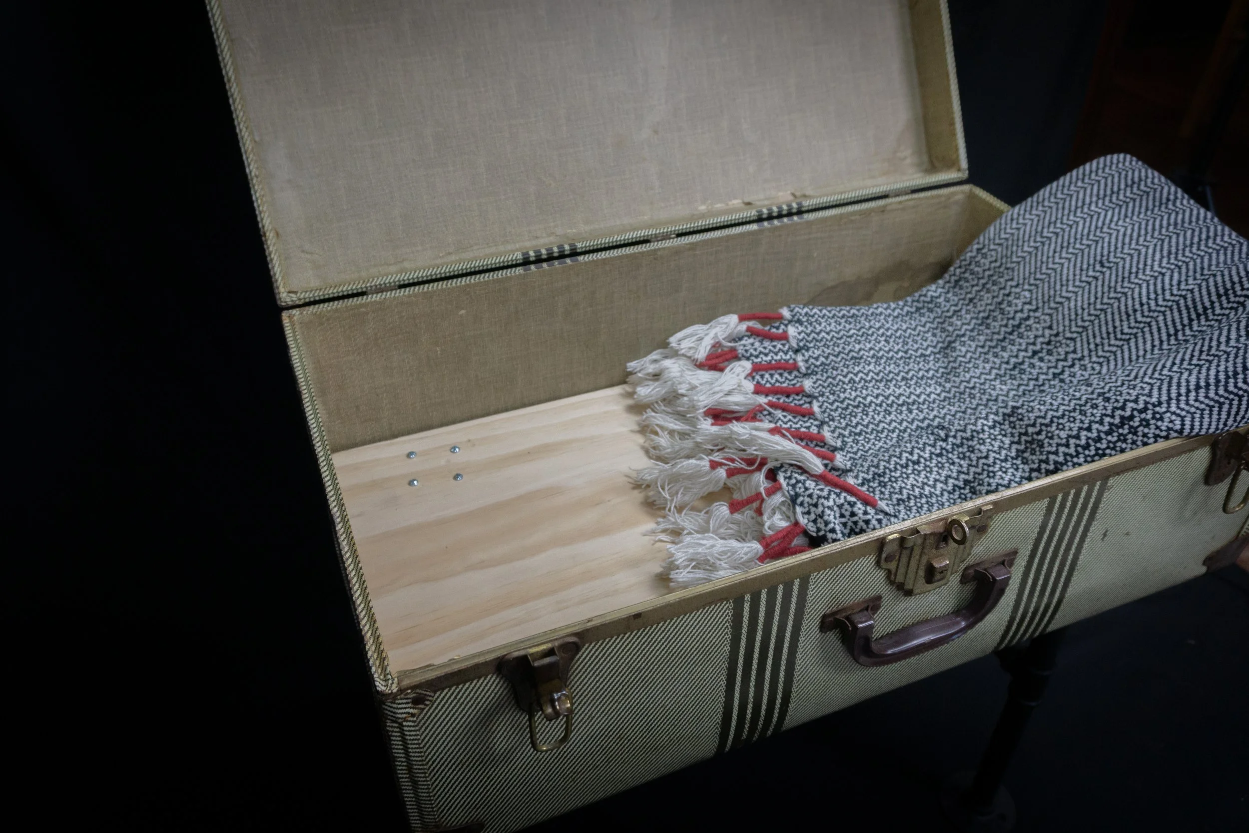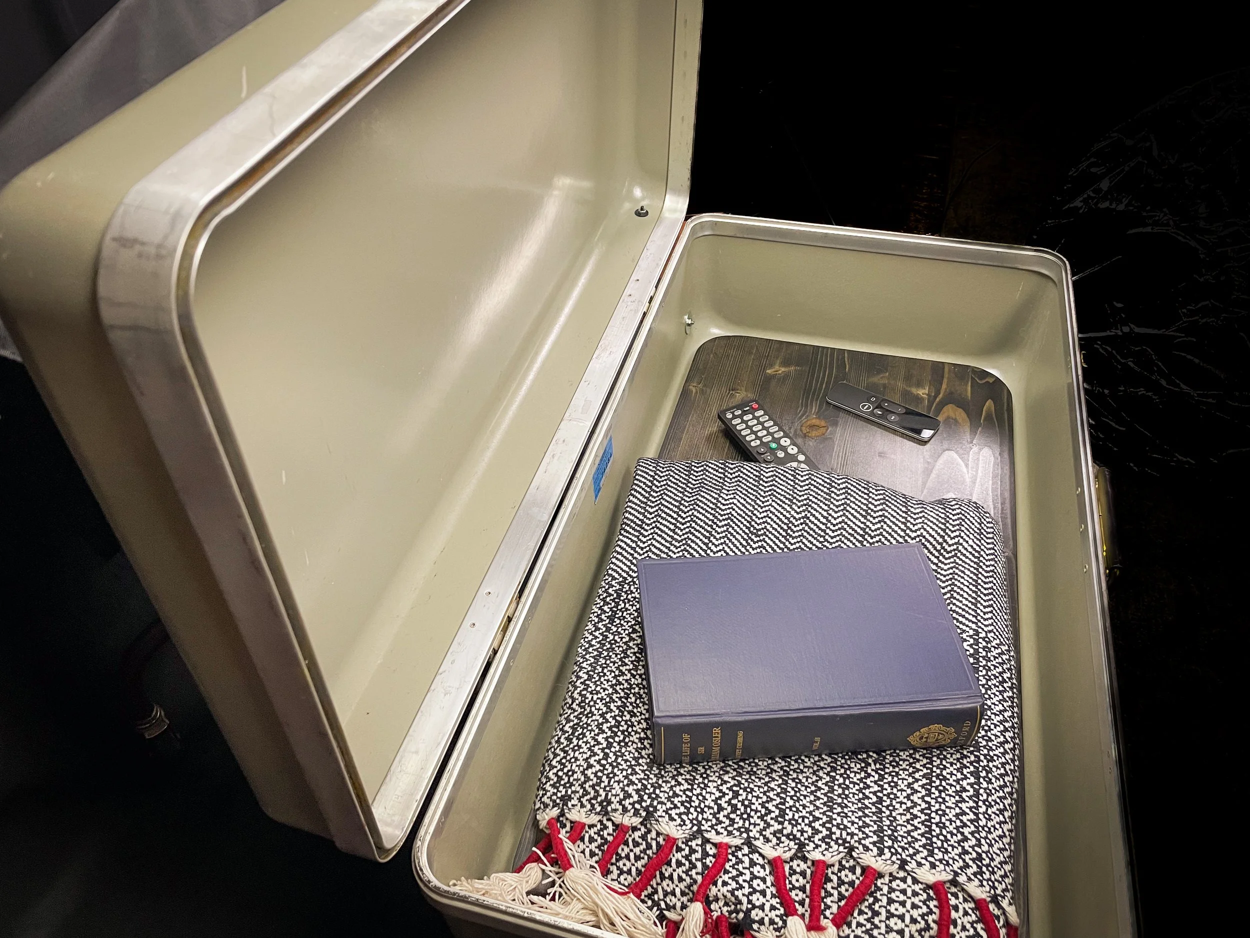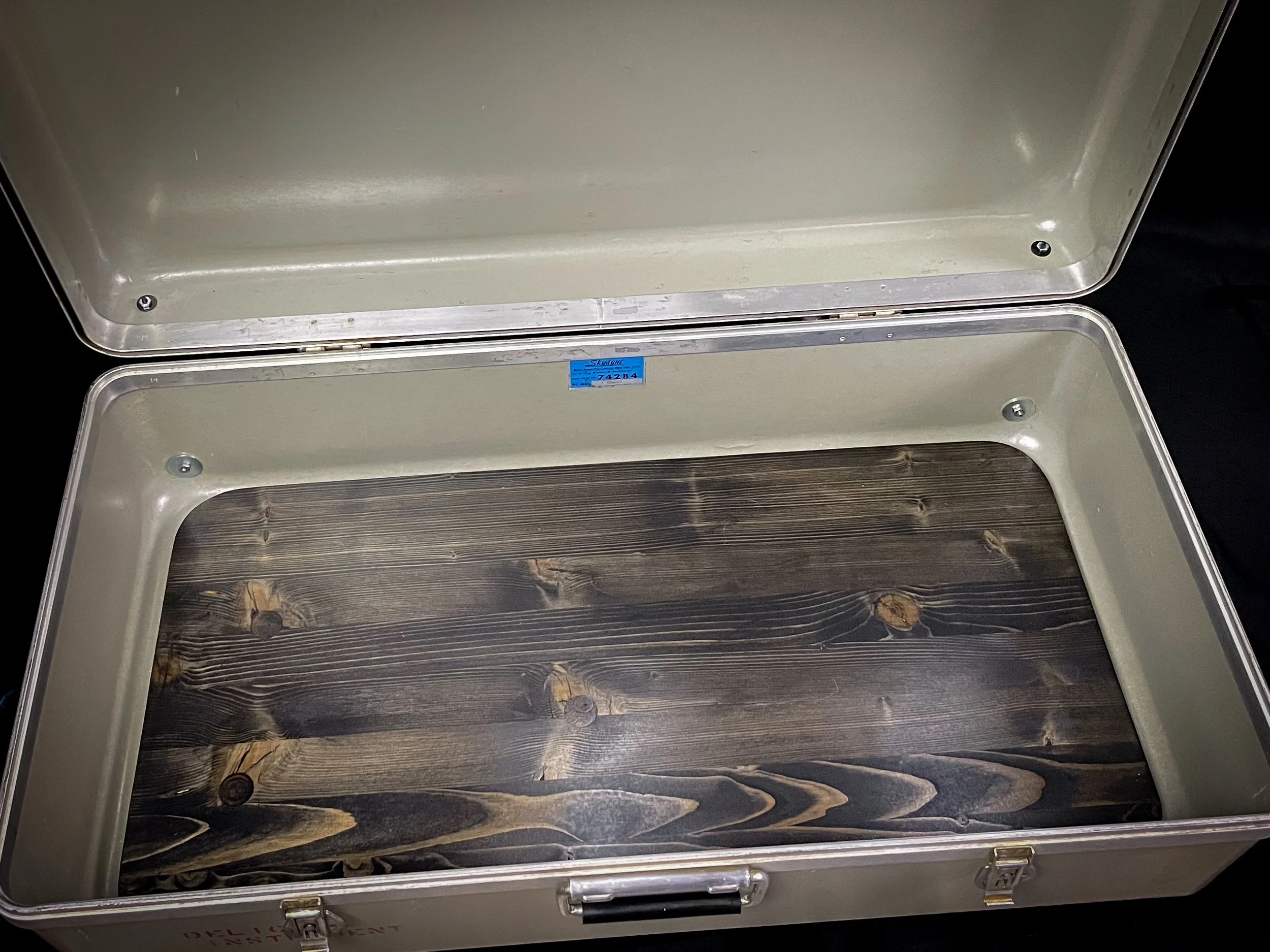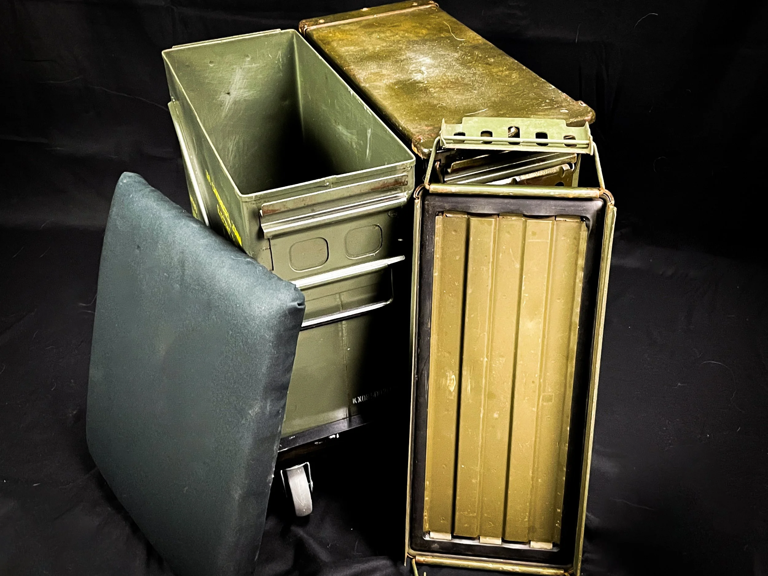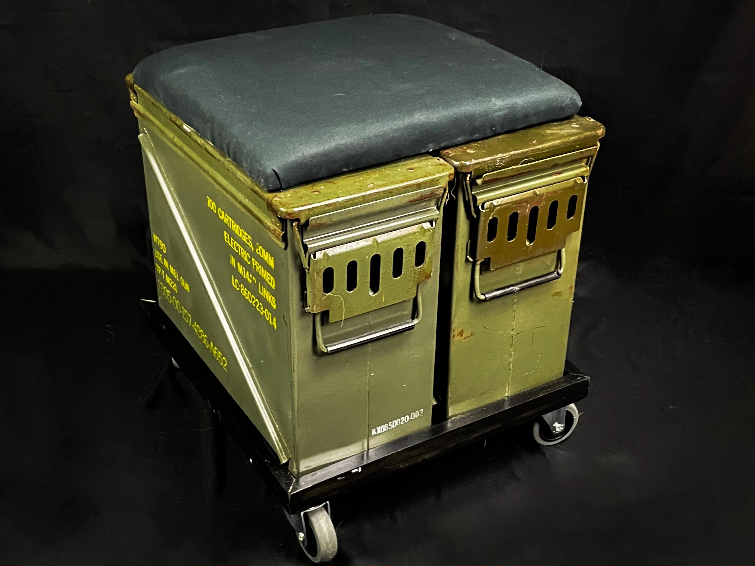 Two military ammunition boxes were mounted on a handmade base with wheels. Bench seat was made to be removed to access the storage in the boxes.