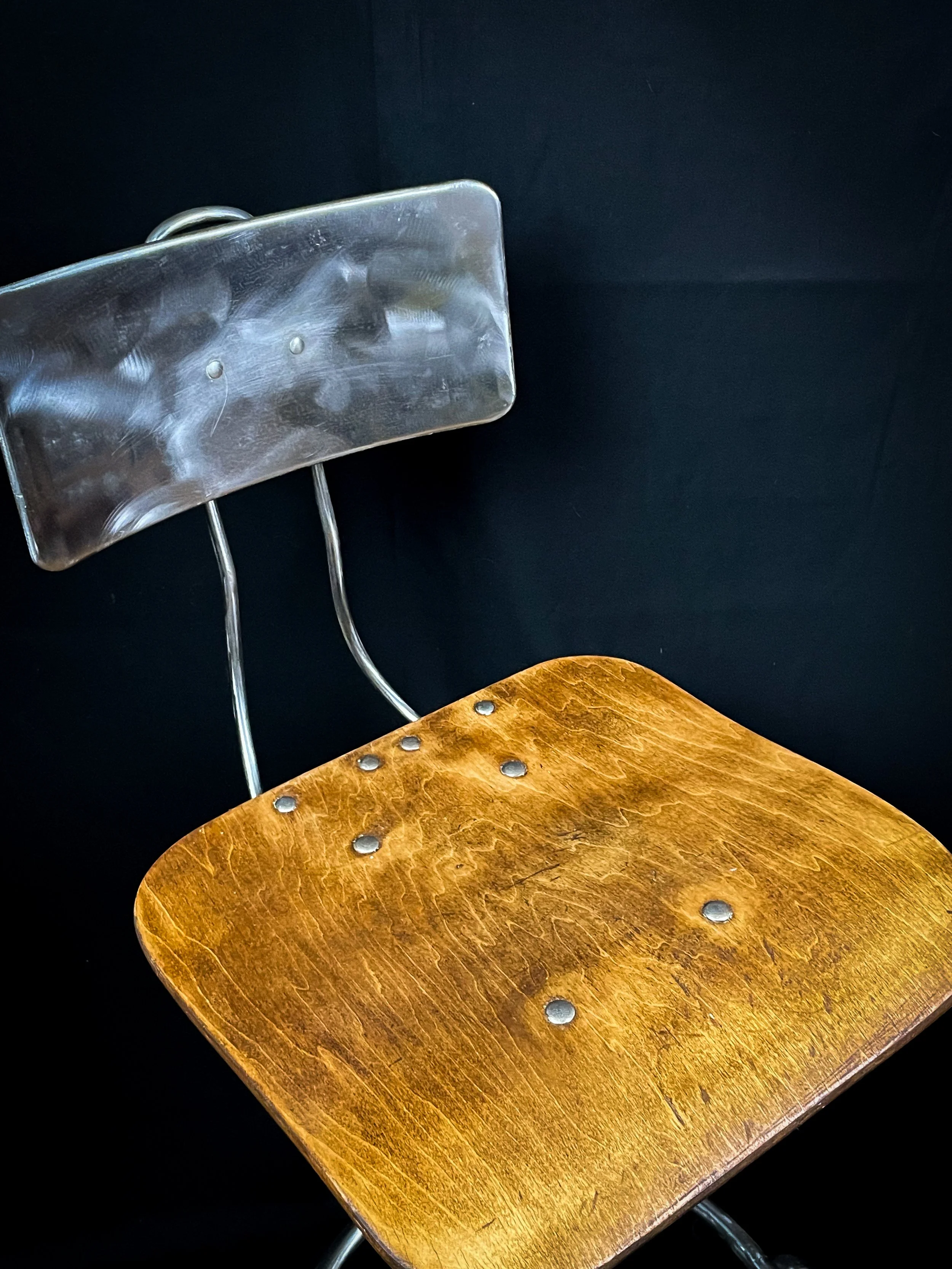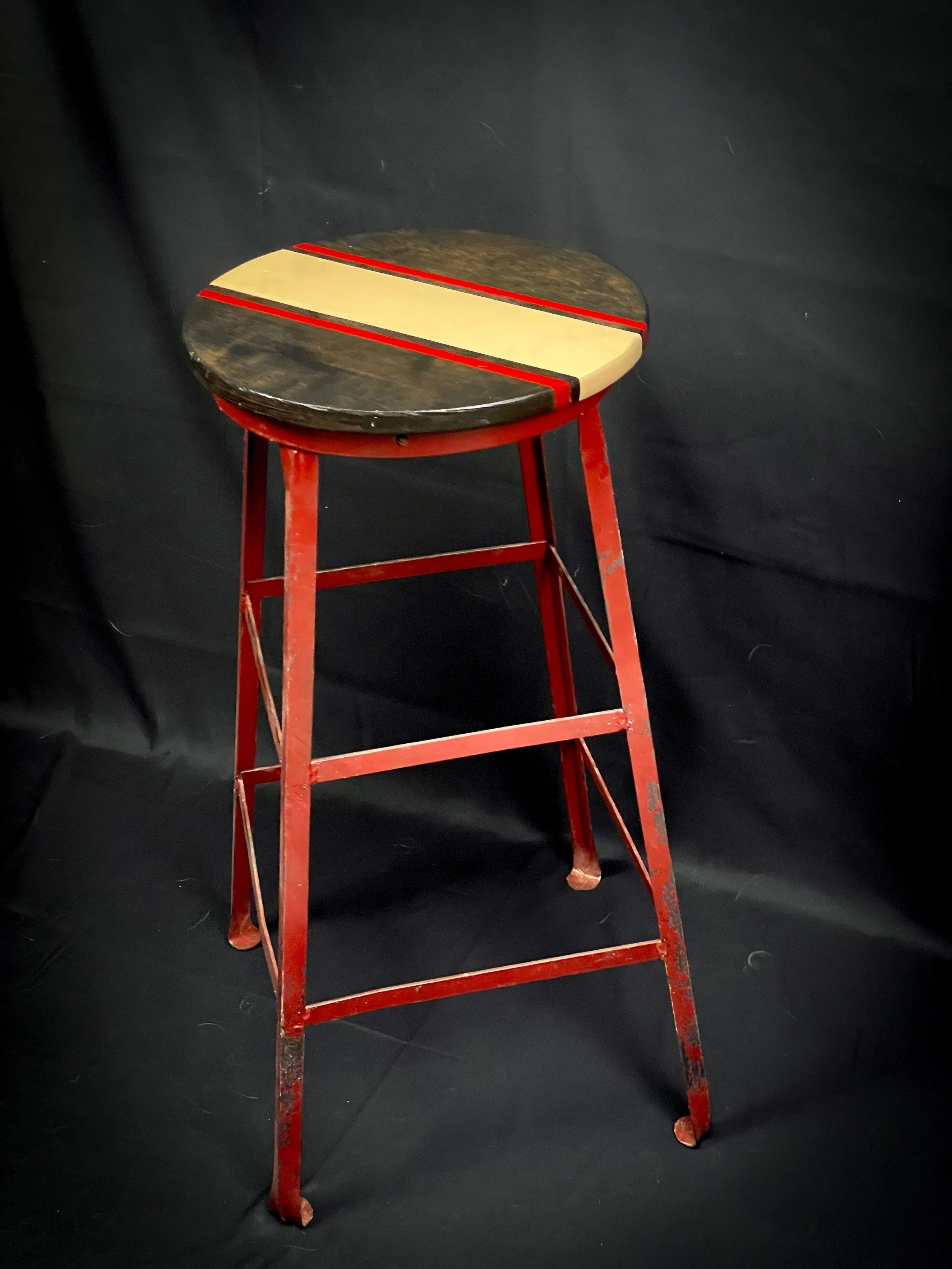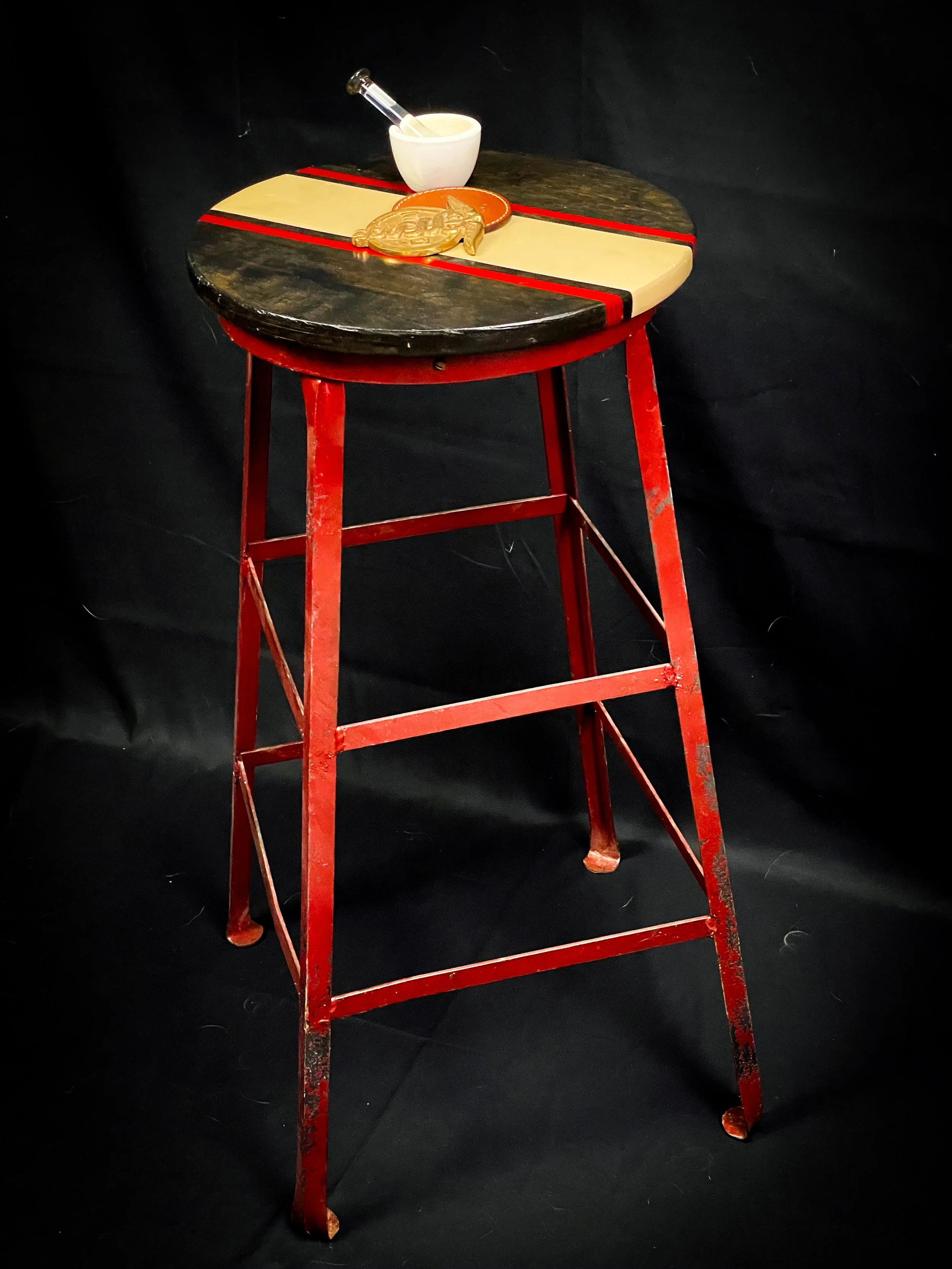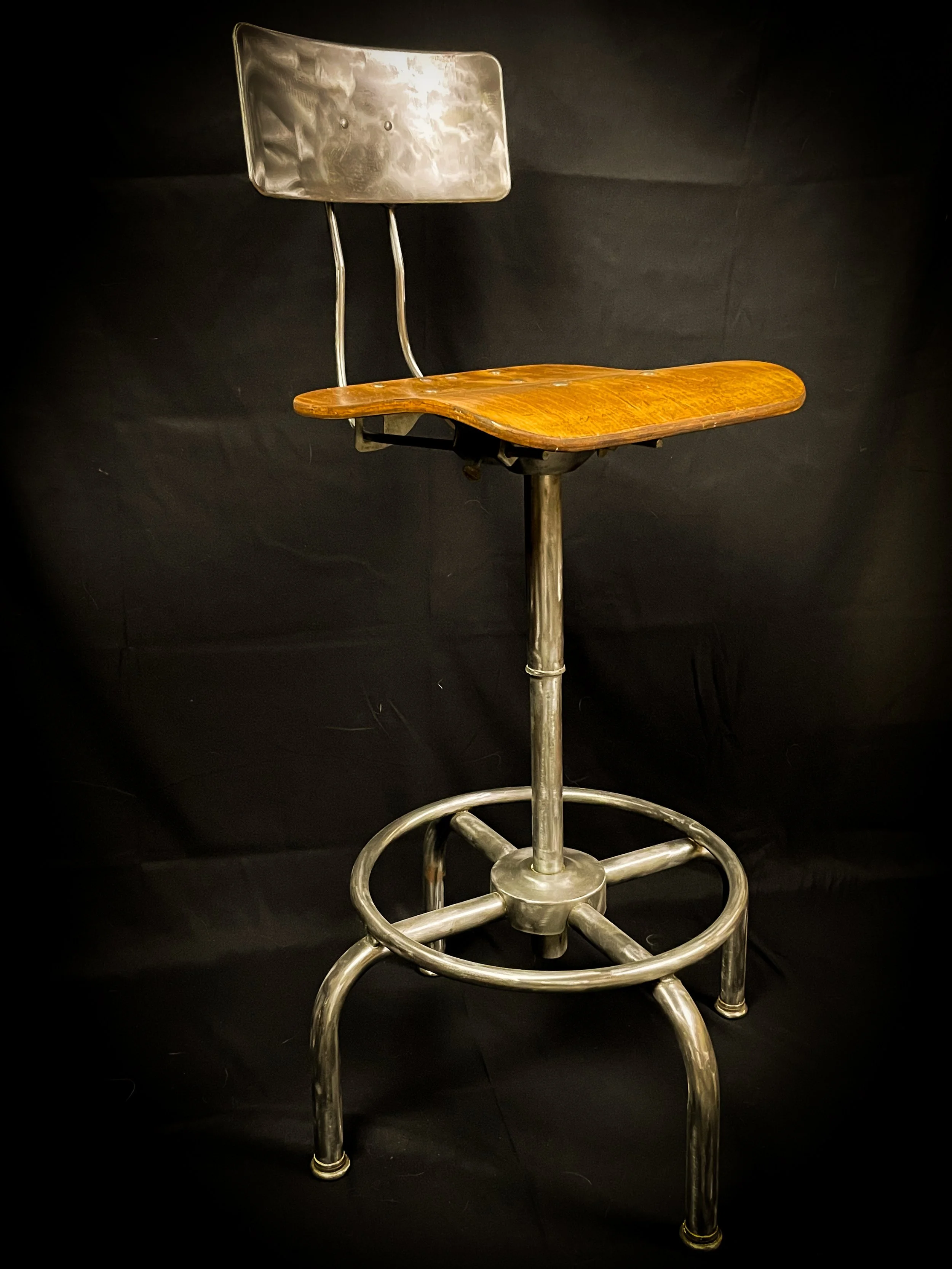 This adjustable medical stool is from the original Saints Hospital and had been painted a light green (poorly painted). The stool was refinished to its original industrial finish.