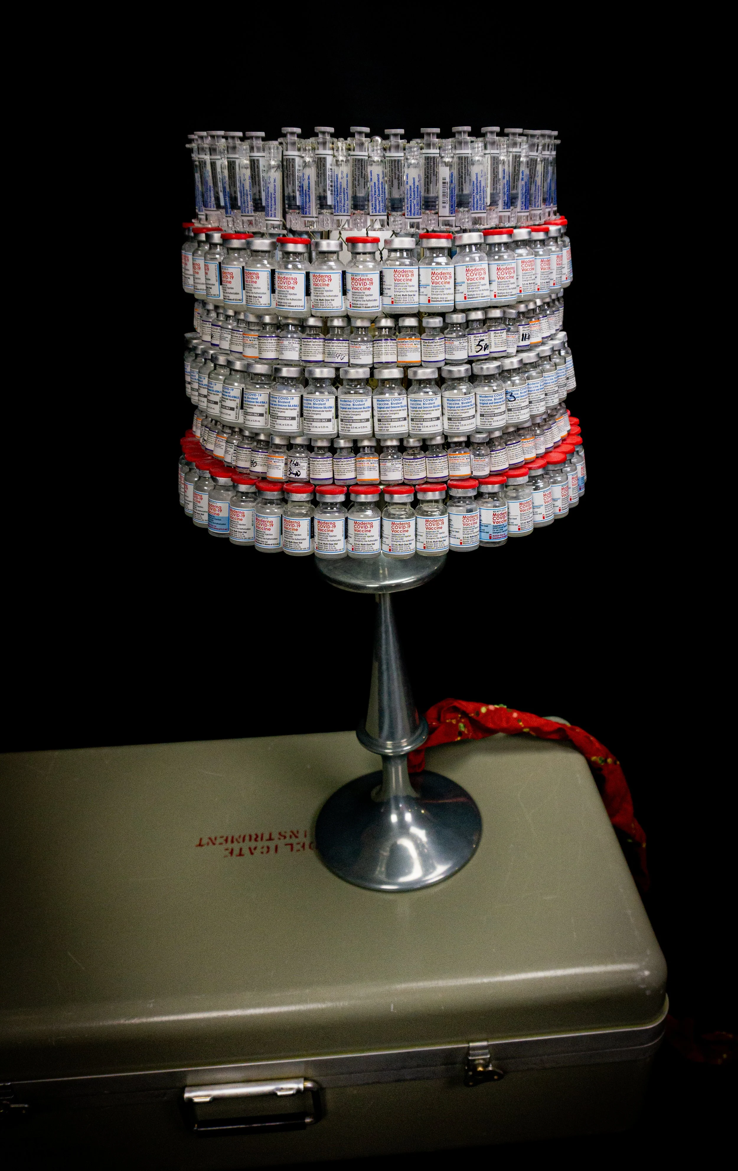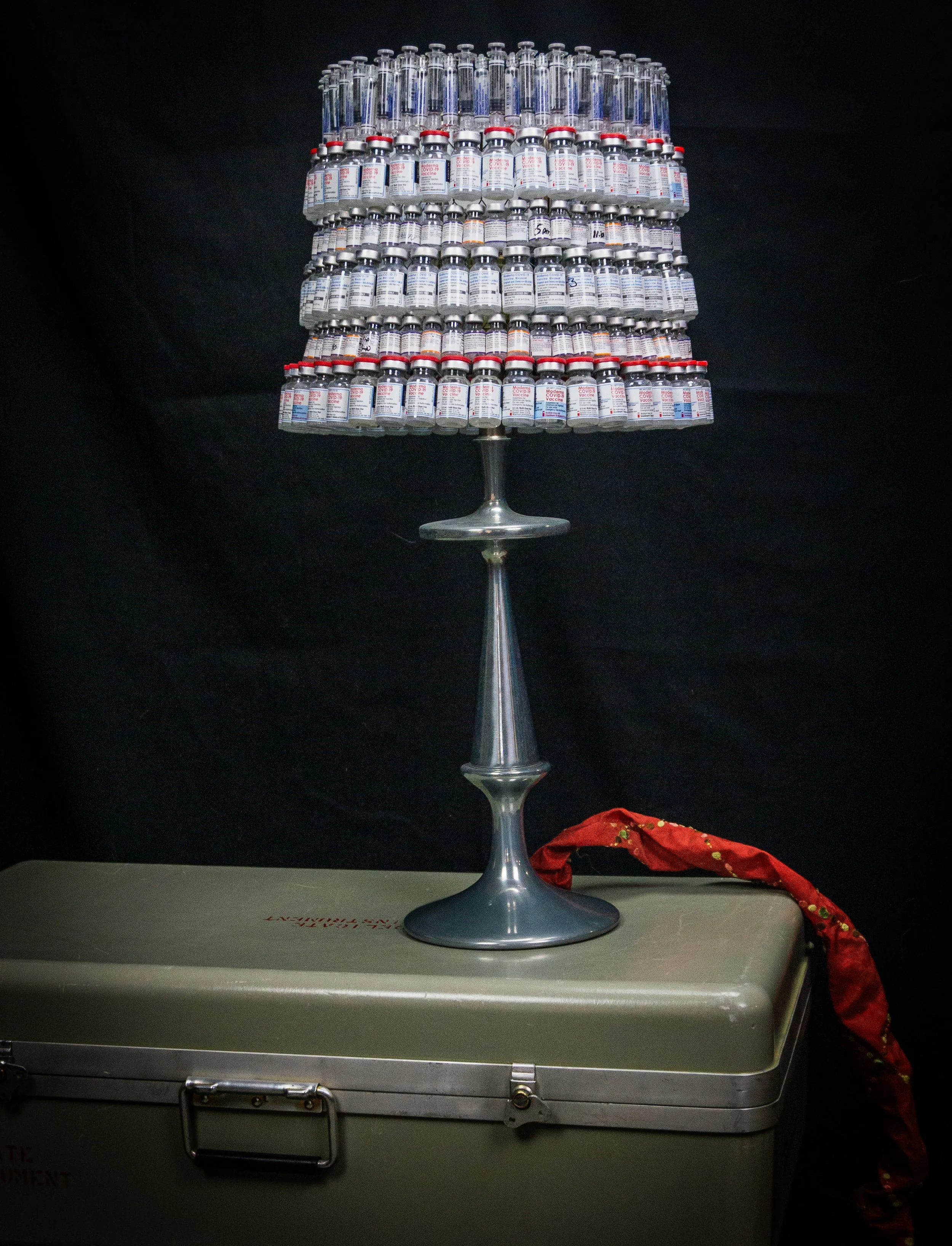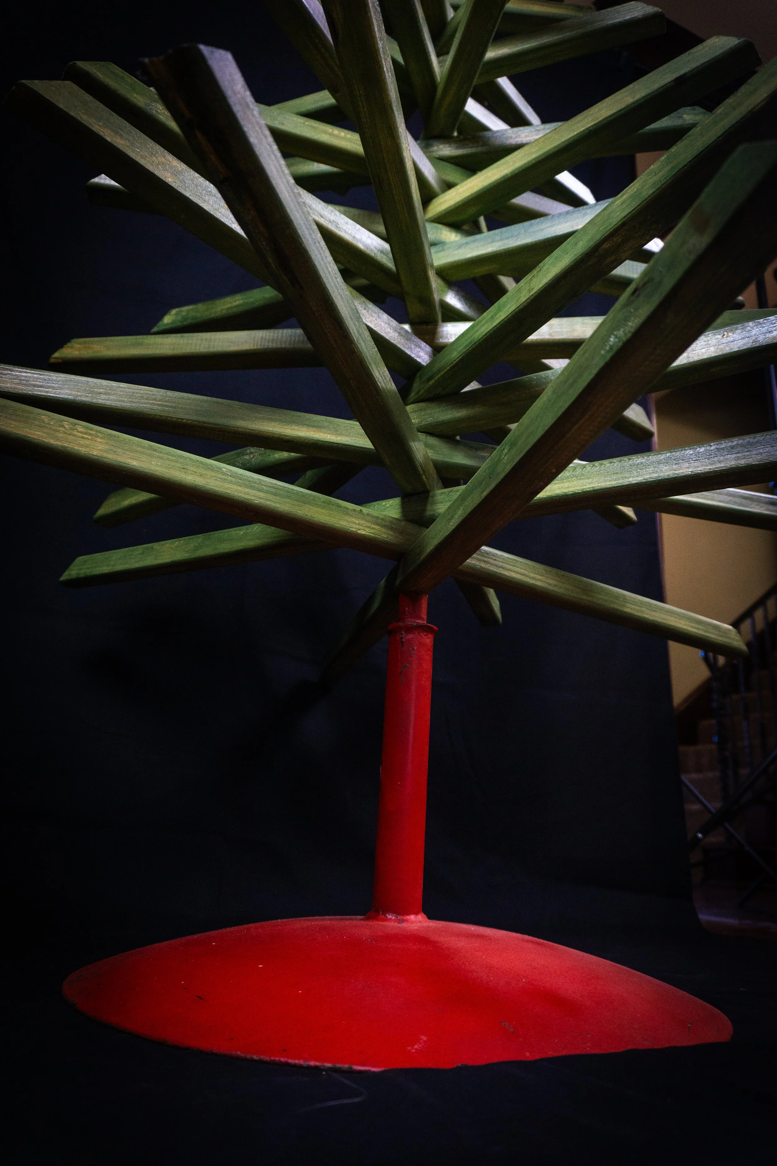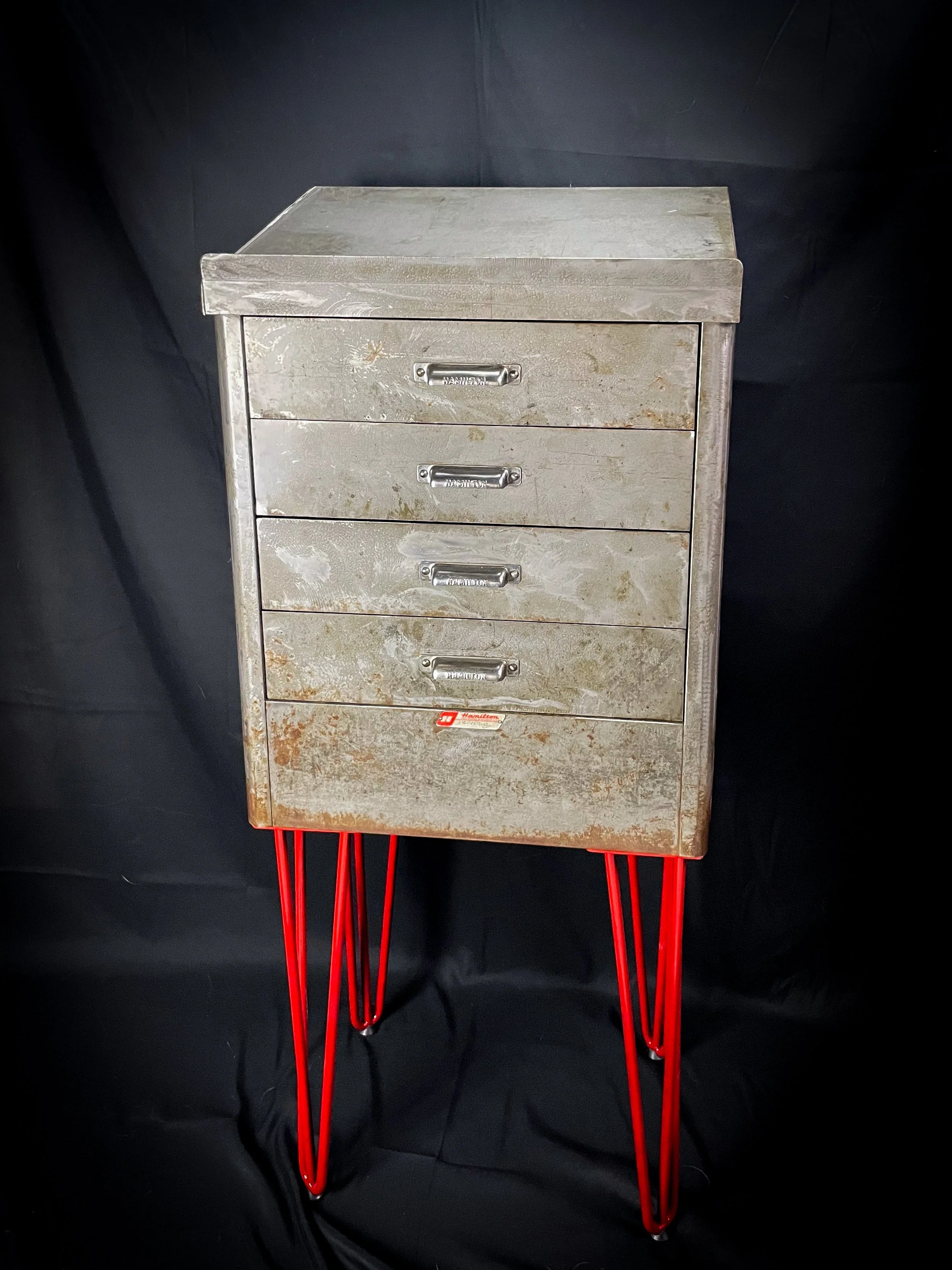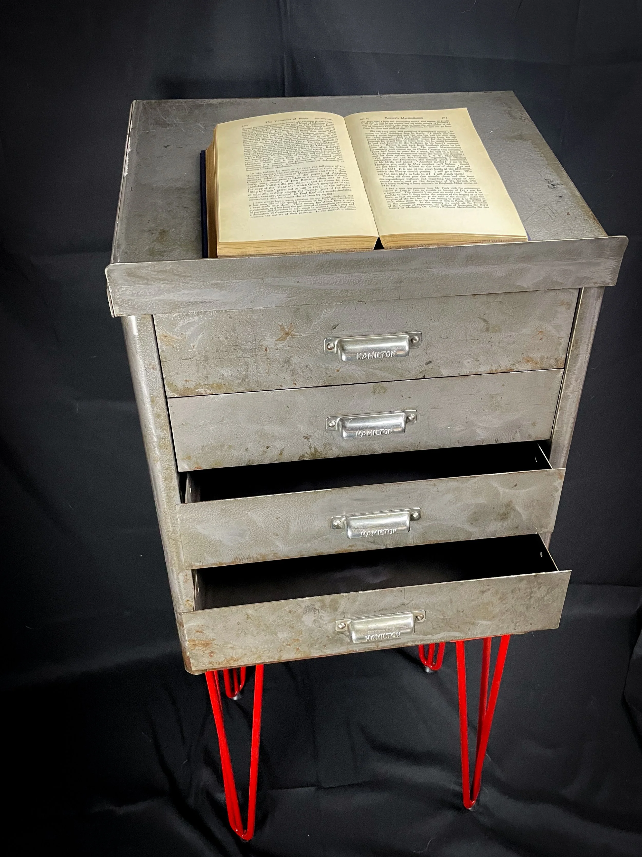 This adjustable medical stool is from the original Saints Hospital and had been painted a light green (poorly painted). The stool was refinished to its original industrial finish.