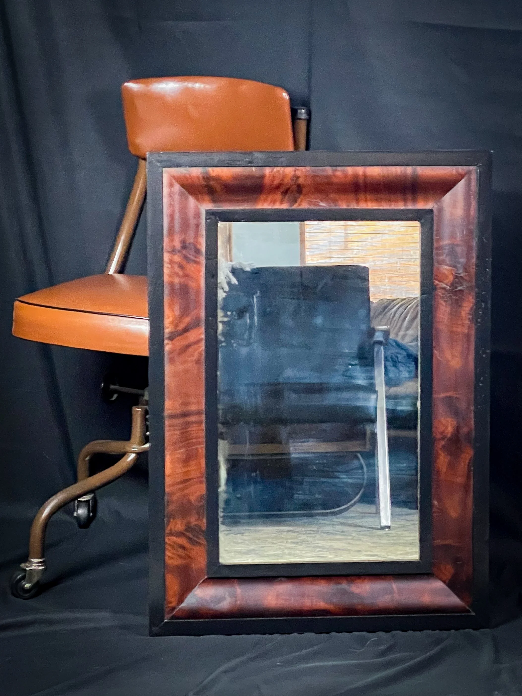 This mirror was refinished due to the missing burl pieces. The flat edges were not salvageable therefore were sanded and painted black. The mirror is still the original lead glass.